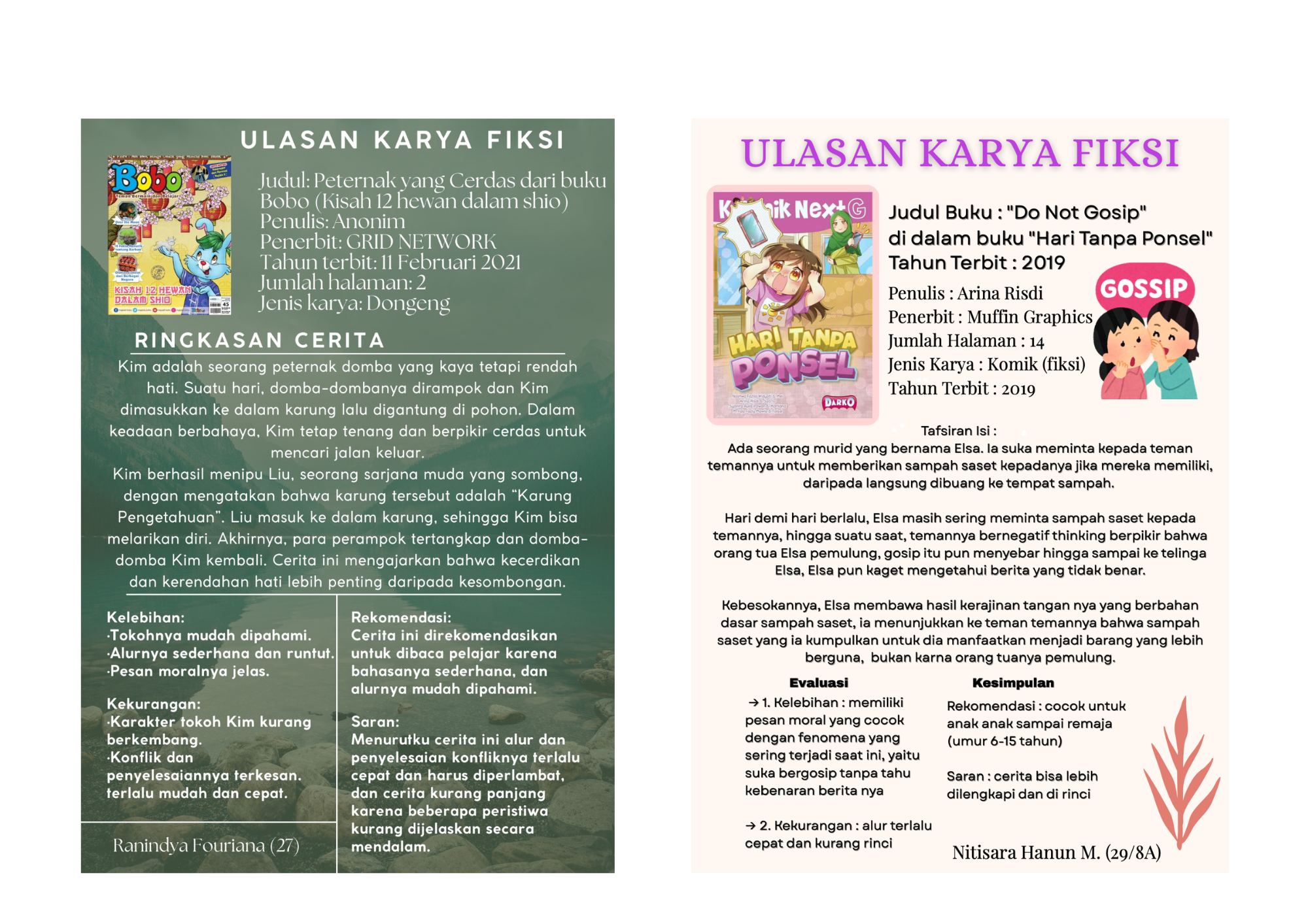 Selanjutnya, siswa diberikan kesempatan untuk memilih salah satu karya fiksi yang mereka minati untuk diulas secara mandiri. Kegiatan ini dirancang agar siswa tidak hanya memahami teori, tetapi juga melatih kemampuan berpikir kritis, apresiasi sastra, serta keterampilan menulis. Untuk menghindari praktik menyalin ulasan dari internet, siswa diminta menyusun ulasan secara langsung di buku tulis berdasarkan pemahaman mereka sendiri dengan berpedoman pada struktur teks ulasan dan mengubahnya pada Canva.